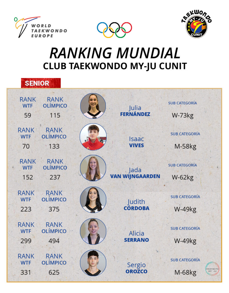 El equipo de competición del Club Taekwondo My Ju Cunit tiene entre sus filas a muchas promesas de nuestro deporte que están destacando a nivel internacional, y que aparecen en los rankings mundiales. A pesar de esta buena trayectoria, sólo los mejores son llamados a pertenecer al Proyecto My Ju. A continuación os damos el ranking del mes de febrero en la categoría senior (mundial y olímpico).