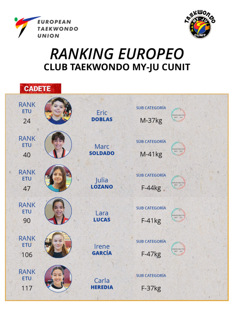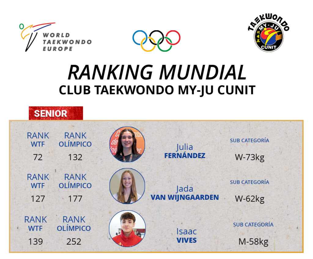 El equipo de competición del Club Taekwondo My Ju Cunit tiene entre sus filas a muchas promesas de nuestro deporte que están destacando a nivel internacional y que aparecen en los rankings mundiales y europeos. A continuación, os damos el ranking del mes de octubre en las categorías senior (mundial y olímpico), junior y cadete (europeo).